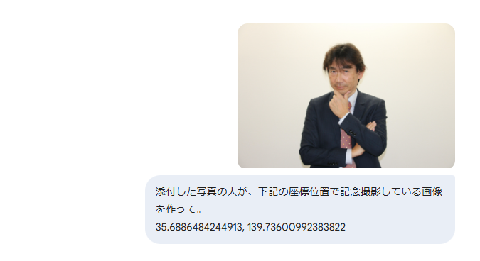 もう一つ、動画の中で印象的だったのが、Google Mapの座標(緯度・経度)を基にした“現場再現”のデモです。地図上の地点の座標をコピーし、「この男性が指定座標の代表的な建物を背景に自撮りした写真を作って」と依頼すると、まるでその場所で撮ったかのような画像が生成される、という内容でした。